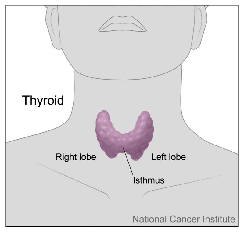 The thyroid gland is a butterfly-shaped organ that lies flat against the windpipe in the throat. It produces the hormones thyroxine (T4) and triiodothyronine (T3) and plays an important role in controlling the body's metabolism.