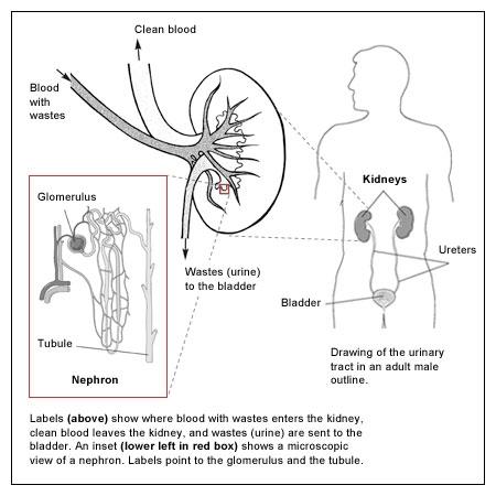 Although the body is equipped with two kidneys, it can function with one reasonably healthy kidney if the other is damaged or removed. However, when kidney – or "renal" – function drops below 25% (people with two healthy kidneys have 100% of their kidney function), serious health problems can occur, and when function drops below 10-15%, critical intervention in the form of dialysis or kidney transplantation becomes necessary to maintain life. This is called end stage renal disease (ESRD or kidney failure).